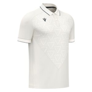 Leisure polo shirt made of polyester Piquet Soft with a Micromesh back for continuous breathability and freshness. Features a knitted polo collar and a geometric embossed design on the front, adding depth and character. Available in various colors.
